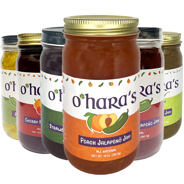 This O'Hara's variety pack includes: Peach Jalapeño Jam, Cherry Habanero Jam, Raspberry Jalapeño Jam, Stawberry Jalapeño Jam, Green Chili Jam, and Jalapeño Jam.