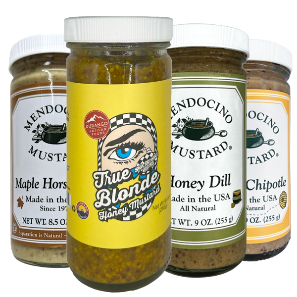 This Mendocino Mustard Please Honey! variety pack includes: Honey Chipotle, Honey Dill, Maple Horseradish and True Blonde Honey Mustard.