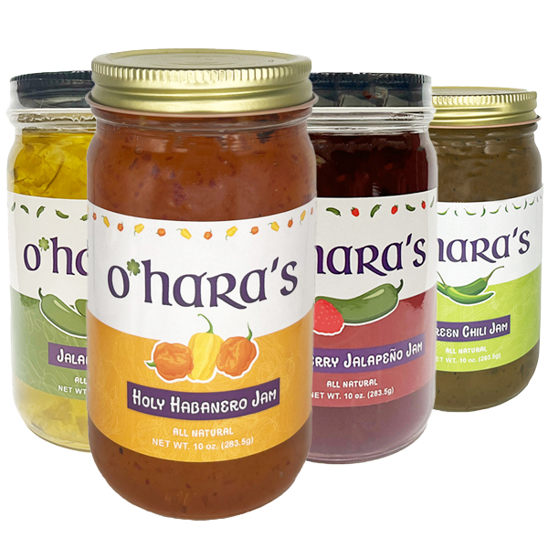 This variety pack include 4 bottles of O'Hara's jams: Green Chili Jam, Holy Habanero Jam, Jalapeño Jam and Raspberry Jalapeño Jam.
